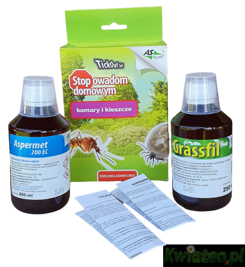 Aspermet 200EC 250ml + Grassfil 250ml utrwalacz = zestaw komplet koncentrat 500m2 oprysk przeciw kleszczom komarom w ogrodzie lub pomieszczeniu.