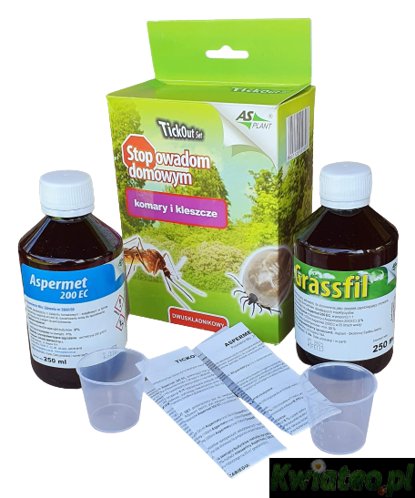 TickOut Set 500ml na KOMARY i KLESZCZE Aspermet 200EC 250ml + Grassfil 250ml utrwalacz zestaw komplet koncentrat 500m2 oprysk przeciw kleszczom komarom ogród tick out