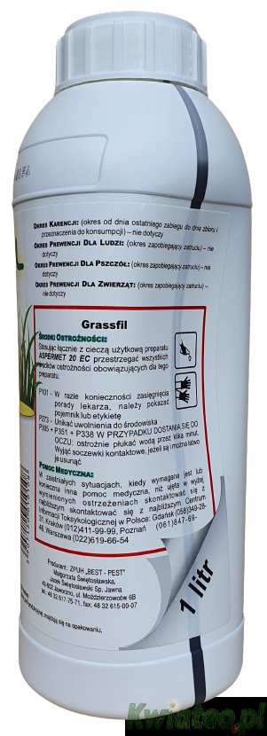 - zalecane jest stosowanie łączne z preparatem Aspermet 200 EC, mieszając obydwa składniki w proporcjach 1:1 bezpośrednio przed użyciem w ilości: Grassfil 1% + Aspermet 200EC 1% = łącznie 2%).