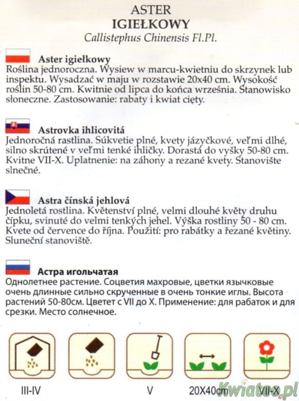 ASTER IGIEŁKOWY - wysiew III-IV do inspektu lub na rozsadniku lub w IV wprost do gruntu.