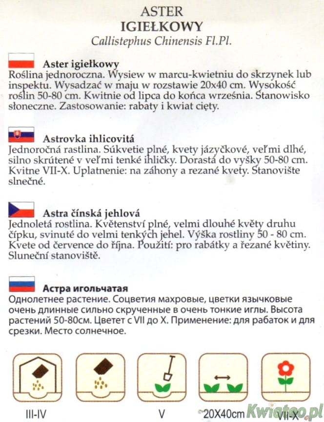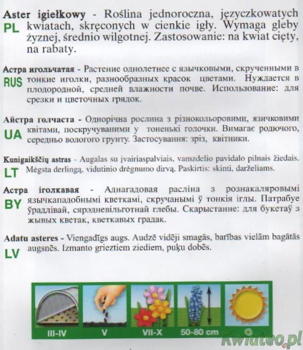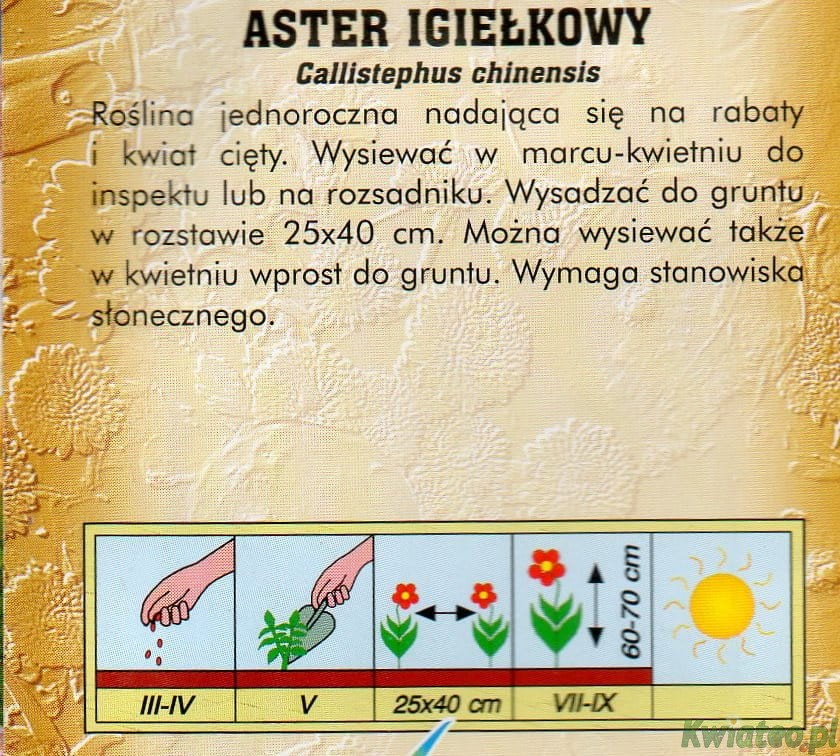 ASTER IGIEŁKOWY - wysiew III-IV do inspektu, lub na rozsadniku, lub w IV-V wprost do gruntu.
