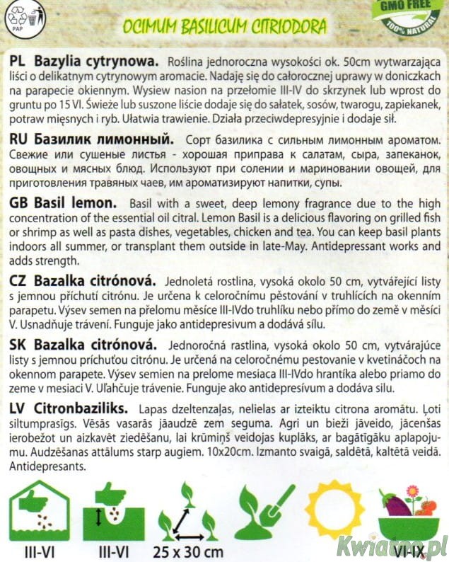 BAZYLIA CYTRYNOWA zielona - wymagania: roślina potrzebuje nasłonecznionego stanowiska, oraz gleby przepuszczalnej i wilgotnej.