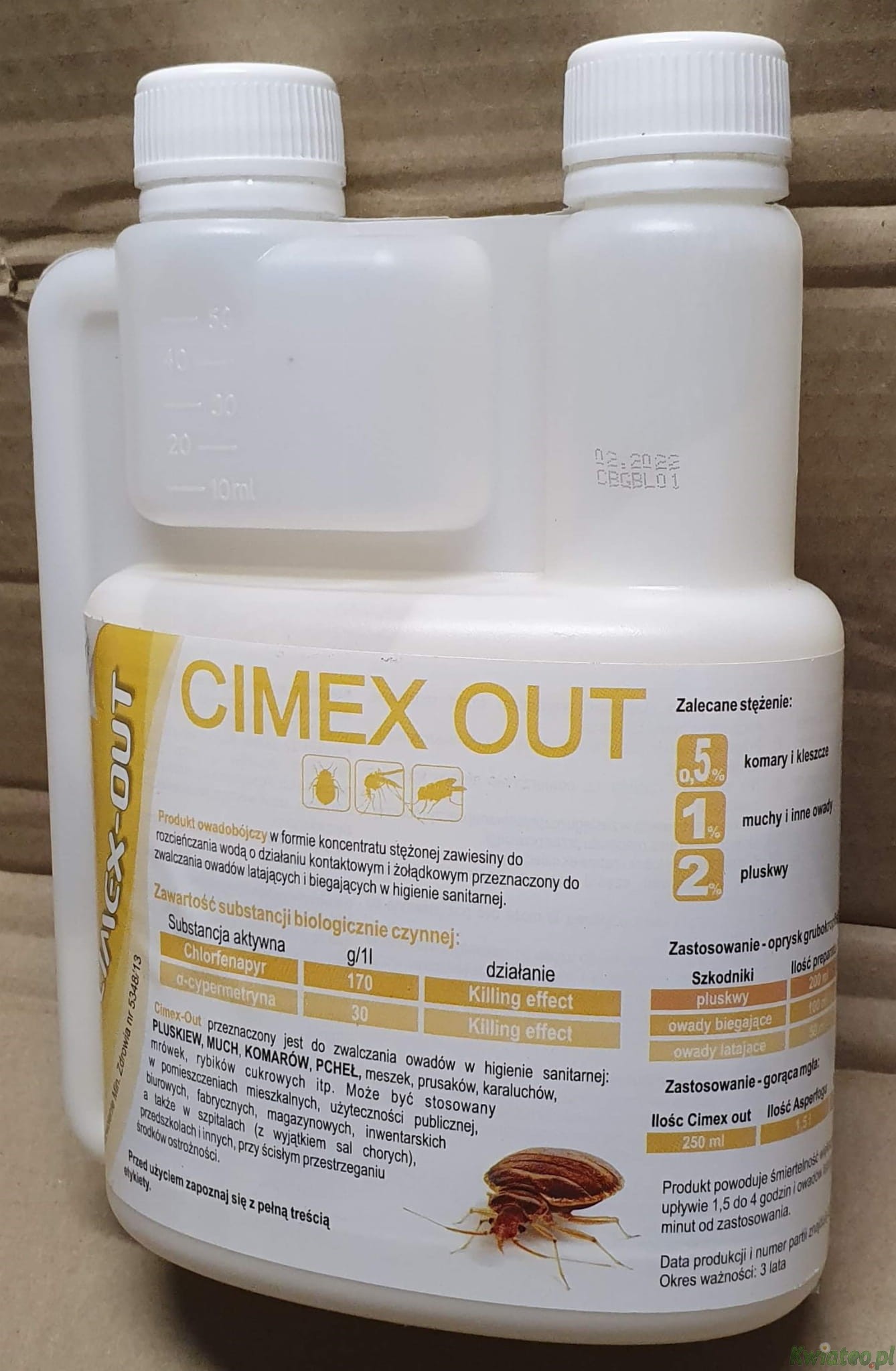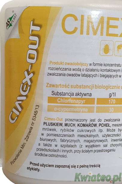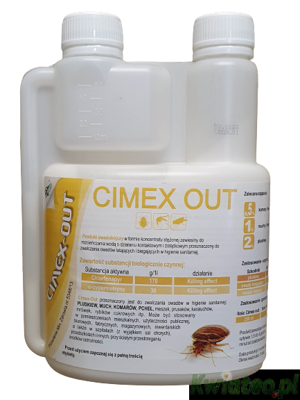 PREPARAT CIMEX-OUT - najmocniejszy zabójca owadów - profesjonalny oprysk kiler dostępny na rynku przeciw owadom latającym komarom, komarom tygrysim, muchom, kleszczom, meszkom, osom, szerszeniom, oraz innym owadom biegającym i pełzającym pluskwom, karaluchom, rybikom, mrówkom w formie bardzo stężonego koncentratu do rozrabiania z wodą, przeznaczony m.in. do oprysku za pomocą typowych opryskiwaczy ręcznych pompowanych lub spalinowych, stosowany w BUDYNKACH i WOKÓŁ BUDYNKÓW.