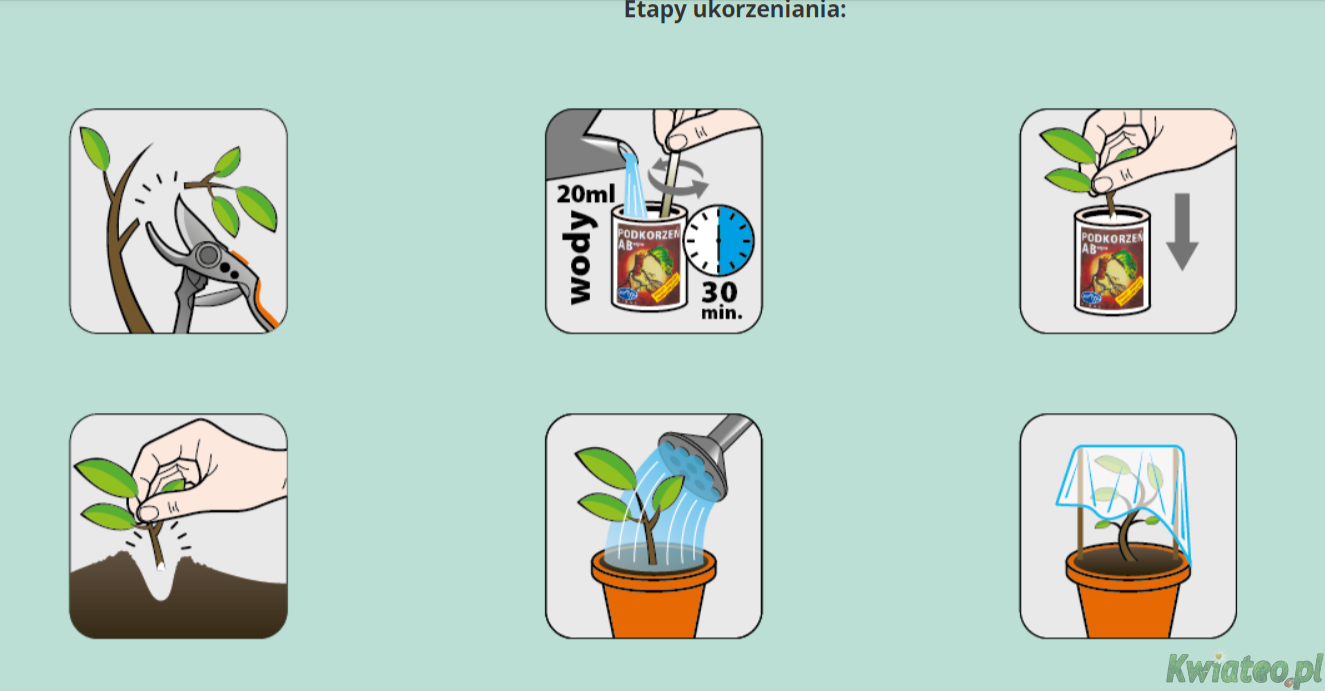 PODKORZENIE produkowane przez firmę Himal - są trwałe, ponieważ są w formie pudru (nie zawierają wody, w której następuje szybszy rozkład hormonów) i nie przenoszą chorób z zakażonych sadzonek na zdrowe. Obcięte boczne pędy (gałązki) zanurza się w odpowiednim ukorzeniaczu na 0,5-2 cm i sadzi do wcześniej przygotowanych dołków. Natomiast przy pikowaniu sadzonek już ukorzenionych zanurza się lub obsypuje korzonki.