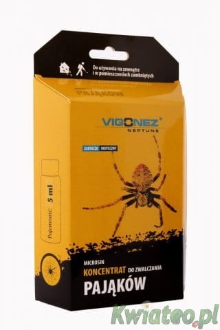Vigonez - koncentrat do zwalczania pająków. Opakowanie zawiera 5 ml, które należy rozcieńczyć w 1Litrze wody. W przypadku dużej ilości pająków należy zwiększyć dawkę do 5ml na 0,5L wody.