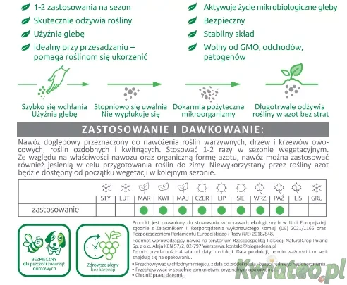 8 kilogramów nawozu wystarcza na około 100m² powierzchni (od 120 do nawet 200 roślin) na cały sezon.