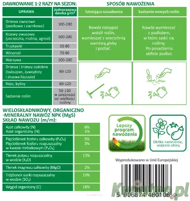 - Nawożenia roślin preferujących niskie pH gleby (np. tuja, sosna, świerk, cyprys, jałowiec, jodła, modrzew, hortensja, rododendron, żurawina, borówka) – dzięki wysokiej zawartości azotu organicznego odżywia rośliny w zgodzie z rytmem ich wegetacji, stymuluje rozrost korzeni i odżywia pożyteczne mikroorganizmy glebowe. Zawartość siarki elementarnej zakwasza glebę i roślinom pobieranie wszystkich niezbędnych składników odżywczych.