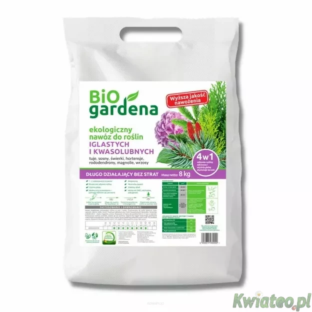 BiOgardena nawóz doglebowy do roślin iglastych i kwasolubnych jest przeznaczony do nawożenia roślin preferujących niskie pH gleby, np. tui, świerków, jałowców, jodły, choiny, cyprysików, modrzewi, sosen, rododendronów, azalii, wrzosów, hortensji czy borówek. Dostarcza roślinom azot organiczny i siarkę elementarną.