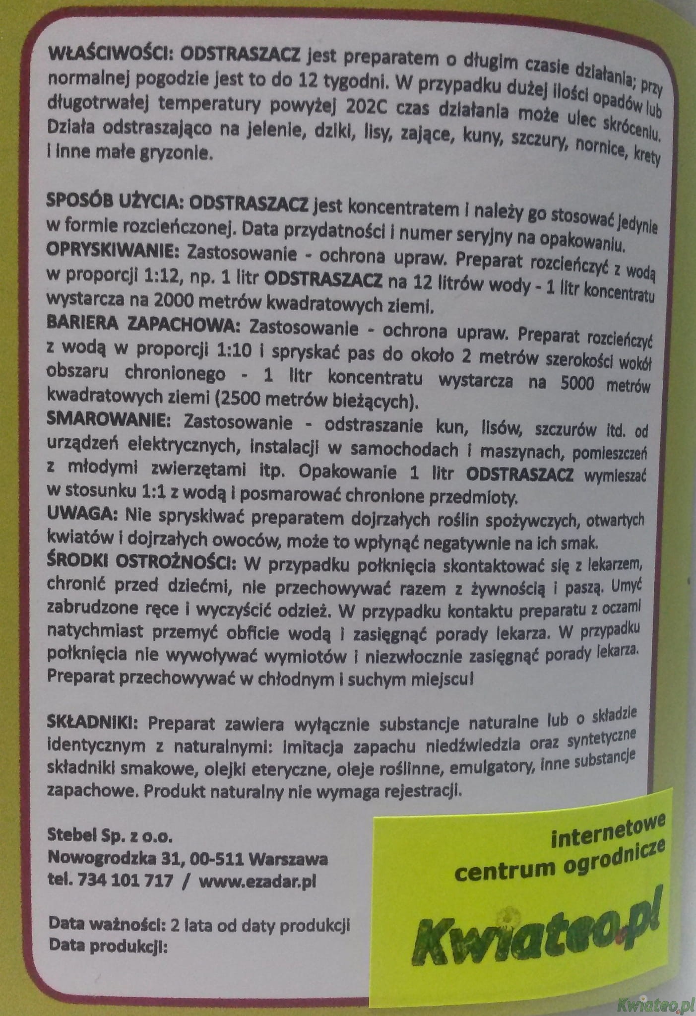 ROLNICTWO LEŚNE i UPRAWY, oraz zabezpieczenie POSESJI i DOMOSTW w przypadku DZIKóW i ZWIERZYNY PŁOWEJ - 1litr koncentratu rozpuścić w 12 litrach wody i opryskać opryskiwaczem zabezpieczany teren lub zrobić ciągły pas ochronny szerokości ok.2 metrów - wokół pól, upraw, lasów, oraz domostw.