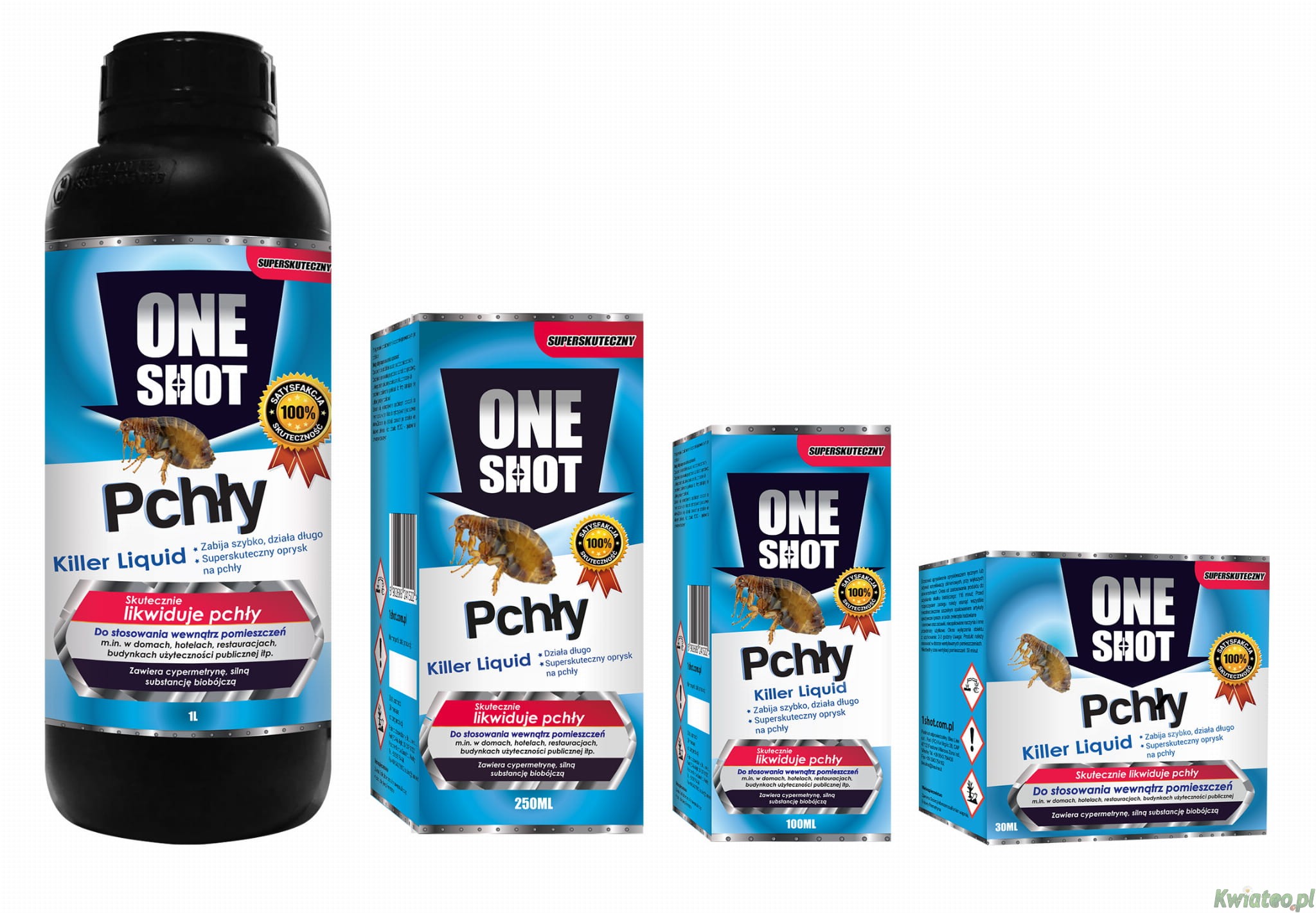 Preparat z serii OneShot na PCHŁY - bardzo skuteczny preparat biobójczy do zwalczania uciążliwych owadów, jak: pchły, muchy, muszki, komary, osy i szerszenie, bąki, chrząszcze, oraz prusaki, karaluchy, pluskwy, mrówki faraona, pająki i inne.