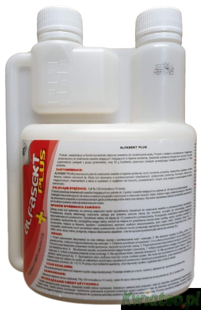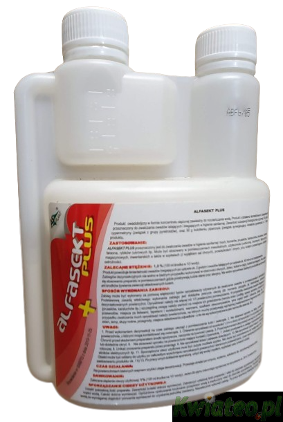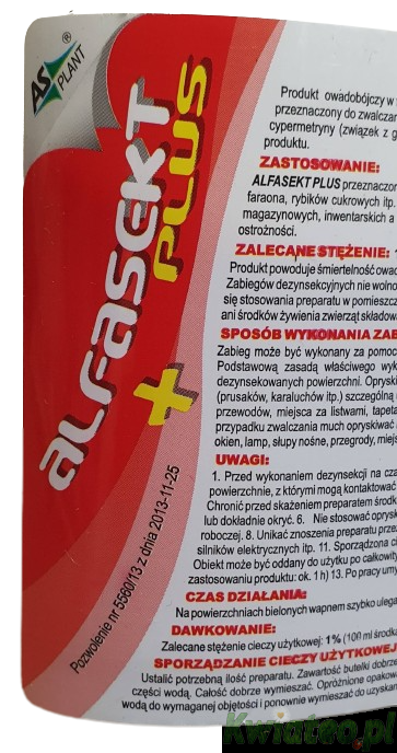 Preparat 'ALFASEKT+ PLUS' w formie bardzo stężonego koncentratu do rozrabiania z wodą, przeznaczony do oprysku za pomocą typowych opryskiwaczy ręcznych pompowanych lub spalinowych oraz zamgławiaczy termicznych, stosowany WEWNĄTRZ BUDYNKóW.