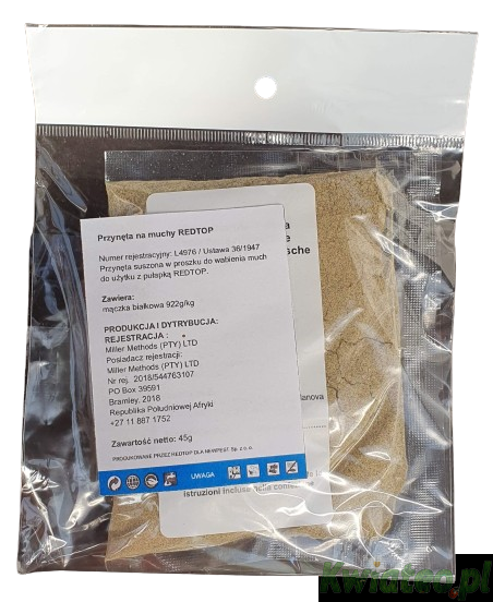 Oferta zawiera 1 porcję przynęty (45g) do dużej pułapki RedTop Giant - należy wsypać do pułapki i dopełnić litrem letniej wody.