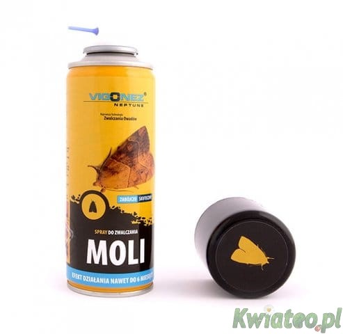 Vigonez - spray do zwalczania moli spożywczych i odzieżowych. Dzięki bezbarwnej formule preparat nie plami i nie pozostawia widocznych osadów.