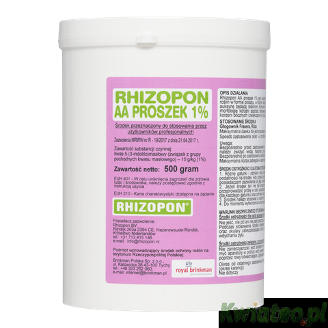 Ukorzeniacz RHIZOPON AA 1% puder / proszek - zawiera syntetyczną auksynę będącą roślinnym hormonem wzrostu i rozwoju.